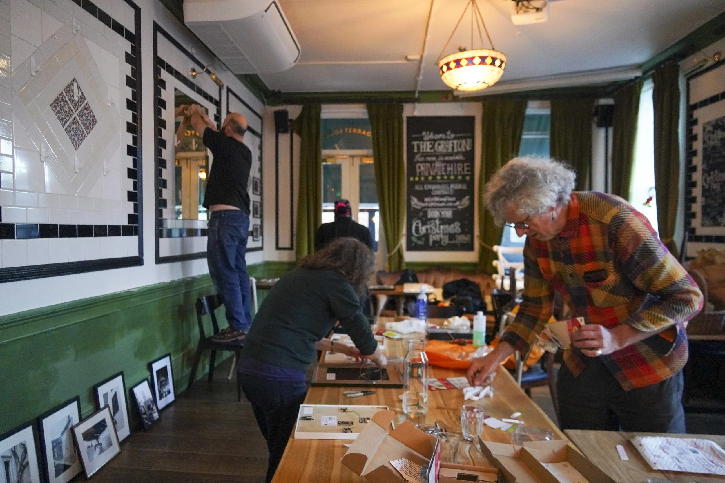 The afternoon was taken up with positioning the temporary hangers and getting all the frames and labels up on the walls. Thankfully, there were plenty of helping hands and the job was accomplished just in time for the pub to start their own preparation for a private hire in the evening.